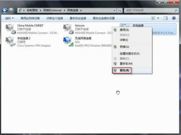 二、右击“本地连接”,选择“属性”。